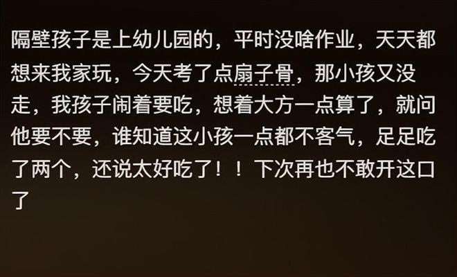 这位家长发帖控诉:近邻家长的孩子泛泛来我家玩,今天烤了点扇子骨,阿谁小孩又没走,我方家的小孩又闹着要吃,我方没见识,念念着大方少许算了,就问阿谁小孩要不要吃?
